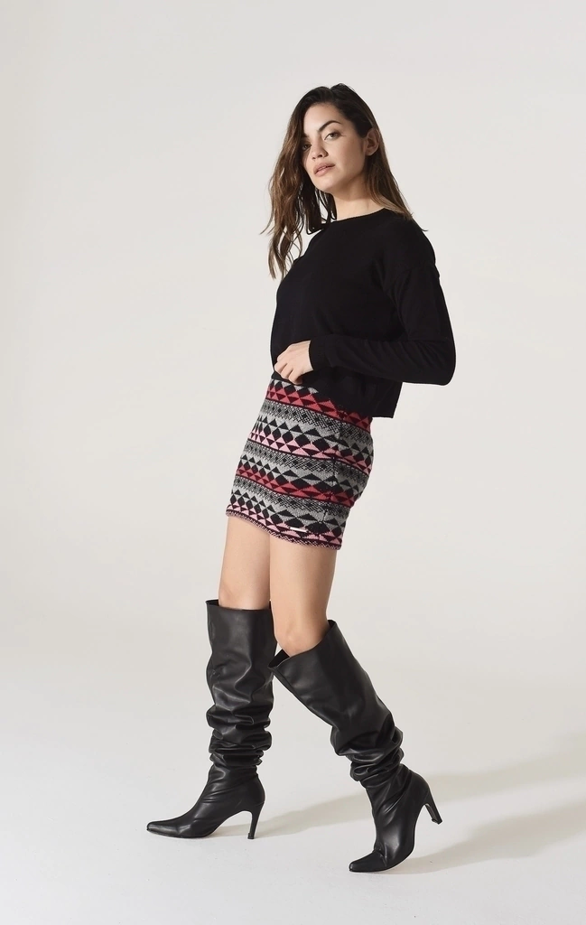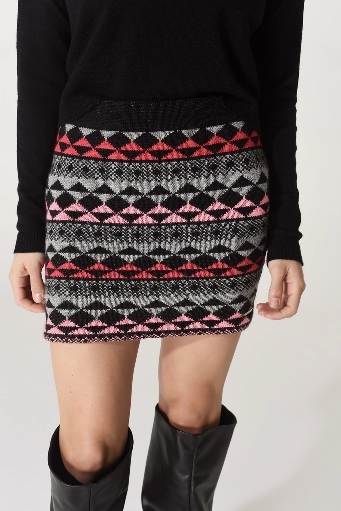 Tejido en maquina manual en técnica Jacquard con dibujos alternados de triángulos. Elástico en cintura. Falda de línea Tubo. Hilos de lurex en las tramas.