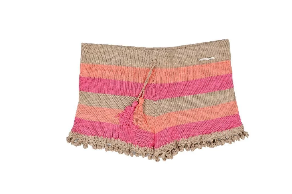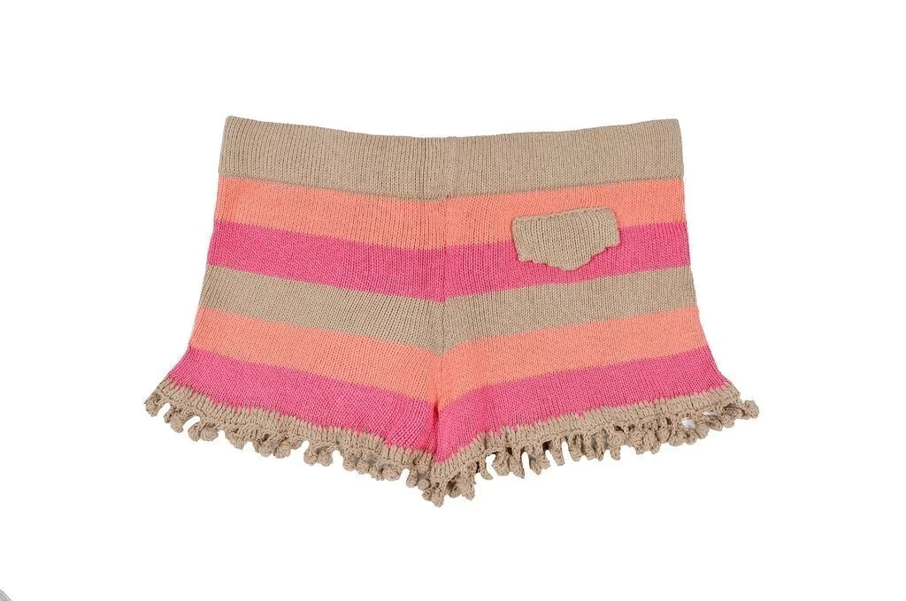 TEJIDO EN MAQUINA MANUAL CON DETALLE DE RUEDO TEJIDO EN TECNICA CROCHET CON DISEÑO DE BOLITAS . TIENTOS TEJIDOS CON TERMINALES DE BORLAS , DETALLE DE TAPA DE BOLSILLO EN PARTE TRASERA. ELASTICO EN CINTURA.