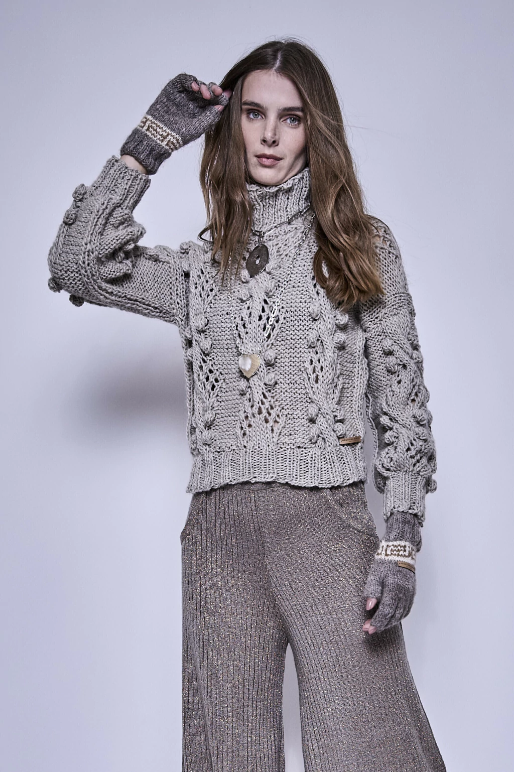 TEJIDO INTEGRAMENTE A MANO EN TECNICA DE PUNTO IRLANDES CON CALADO Y BODOQUES. MATERIAL PREMIUM PURO DE ALTA CALIDAD. CUELLO POLERA.